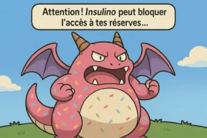 Mais attention, le chemin est semé d’embûches ! Surgit alors Insulino, le grand dragon sucré, capable de bloquer l’accès aux réserves énergétiques. Quand l’insuline est trop présente, le corps n’arrive plus à puiser dans ses graisses et la fatigue guette. C’est lui qui bloque l’accès aux réserves d’énergie qui sont dans les cellules remplies de gras. Il est là dès qu’on mange et qu’on digère.