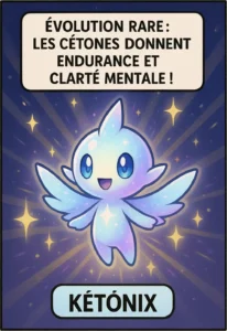 Apparaît alors Kétonix, l’étincelant Pokémon cristallin. Les cétones sont une source d’énergie propre et stable, qui alimentent le cerveau et les muscles tout en offrant endurance et clarté mentale. C’est la grande évolution de l’aventure cétogène ! Mais pour qu’il apparaisse il faut la disparition des glucides de l’alimentation.