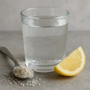 Si tu veux un truc simple : demi-cuillère de sel dans un grand verre d’eau chaude, avec un peu de citron si tu veux te sentir vivant. À boire lentement. À renouveler 2 à 3 fois par jour les premiers jours. Et tu peux saler plus tes plats, c’est le moment.