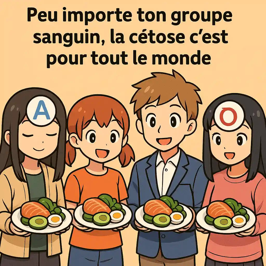 Peu importe si ton sang crie « A », « B », « AB » ou « O »… tes cétones s’en fichent royalement ! Ce qui compte, c’est ce que tu mets dans ton assiette, pas ce qui circule dans tes veines. Alors, sors tes avocats et ton saumon : la cétose, c’est pour tout le monde !