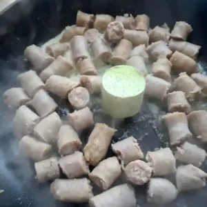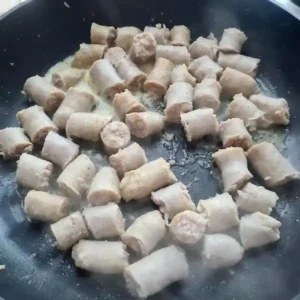 - Couper chaque chipolata en 6 ou en 8 morceaux et les faire revenir dans la poêle à feu relativement vif.